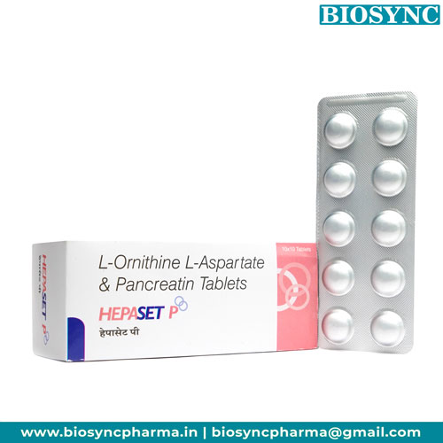 L-Ornithine L-Aspartate & Pancreatin Tablets – HEPASET P TAB has two medicines called L-Ornithine L-Aspartate and Pancreatin, which are used to help with indigestion and liver problems. L-Ornithine helps lower the amount of ammonia in the blood. This helps the sick liver work better. L-Aspartate helps produce energy and supports the healing of damaged liver cells. Pancreatin helps break down food in the digestive system.