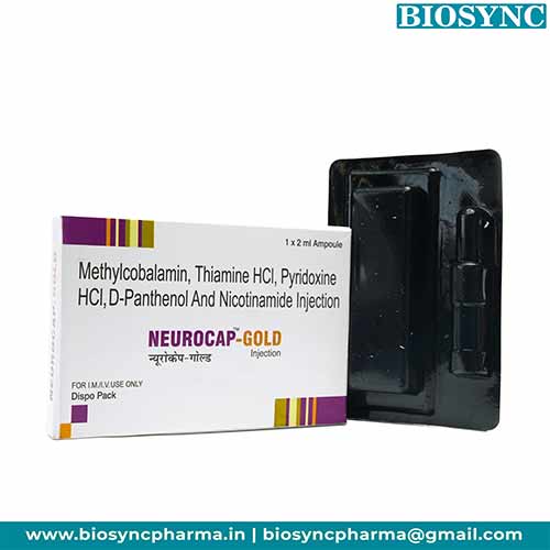 Methylcobalamin, Thiamine, Pyridoxine, Nicotinamide & D-Panthenol Injection – NEUROCAP-GOLD INJ is a mix of several medicines called Methylcobalamin, Thiamine, Pyridoxine, Nicotinamide, and D-Panthenol. It is used to help with a lack of important nutrients in the body. It helps nerves grow back, makes nerves healthier, eases nerve problems, and helps treat megaloblastic anemia and other kinds of anemia. It helps heal and keep nerve cells, manage harmful substances, strengthen the immune system, and lower homocysteine levels. It also has important vitamins and minerals that help the body work properly.